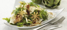 Fold et bagepapir, og læg det i bunden af en form på ca. 20x26cm. Sørg for, at bagepapiret har kanter. Hæld dejen i formen og sørg for, at fordel dejen helt ud til kanterne. Bag ved varmluft ved 150 ° C i 20 minutter. Lad omeletten afkøle lidt og vend den herefter ud på hovedet på et plastskærebræt eller et stykke stanniol. Løsn forsigtigt bagepapiret.
